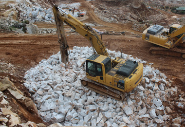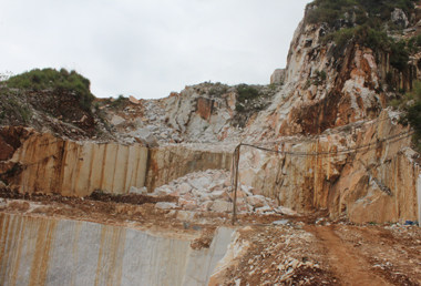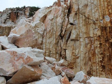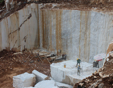 圖3結(jié)構(gòu)完整的大理石礦,被工人在山上就地切成塊狀,運(yùn)到山下通過圓盤鋸的切割,制成天然大理石板材。