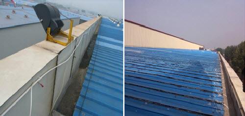 該部位漏水的主要原因是:氣樓與屋面交接處收邊下未放置泡沫堵頭,且收邊縱向搭接未敷設膠泥或硅膠;屋面外板在氣樓交接處未上板;氣樓結構支柱開孔部位未做防水處理;氣樓自身制作、安裝存在漏水隱患。