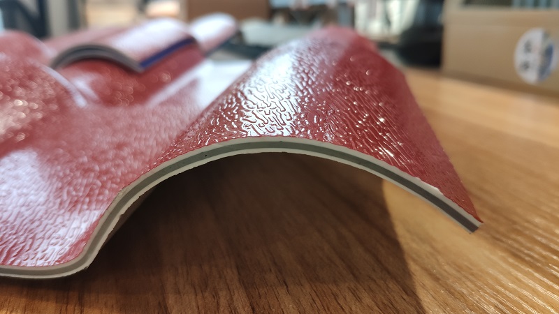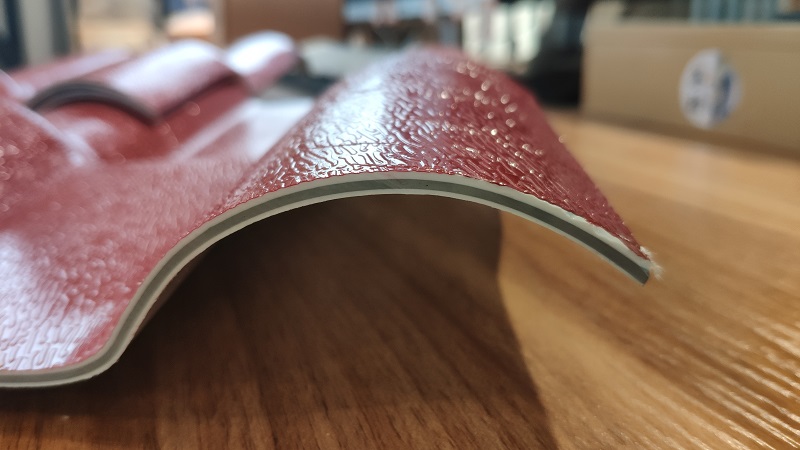 市面上看到的樹脂瓦,兩層白中間灰這種就是四層白底樹脂瓦,是2021年樹脂瓦行業主推的一款產品,它具備高性價比,抗開裂,有硬度也有軟度,在原有層或者三層樹脂瓦的情況下進行了升級,在asa膜下多加了新料pvc,目的防止開裂,灰色為骨架層作為外形的支撐,上下為新料pvc增加樹脂瓦的柔韌性以及抗延展性,有效的提升瓦的美觀度,以及增加瓦底部亮度,耐磨效果。