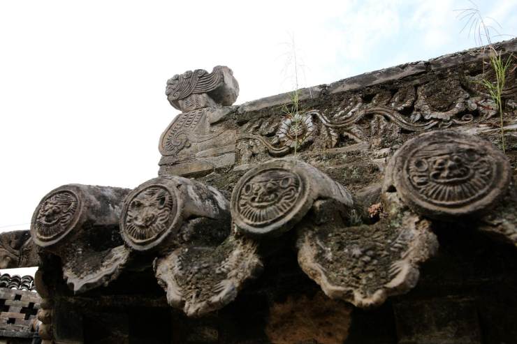 古代著名商幫之一的晉商發達后,在三晉大地上留下了眾多豪宅府邸,檐下瓦當多用獸頭圖案。另一著名商幫徽商也在發祥地徽州大興土木,瓦當的樣式稍有變化,上凸頗像一個頭冠。云南邊陲開采云錫的礦主們,在靜無聲息的發了財后,將安身居所建造到了**,不輸江南的精美木雕,不輸晉中的精美石雕,不輸徽州的精美磚雕,還有那層層疊疊檐下花卉瓦當。當年,法國人不惜血本在中國土地上修建鐵路,不僅僅是覬覦云錫吧?會不會是滇南民居也讓他們欽慕不已,瓦當是能嗅得出***中國味道的老物件。