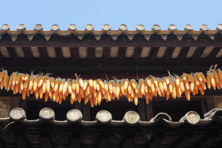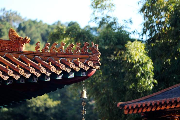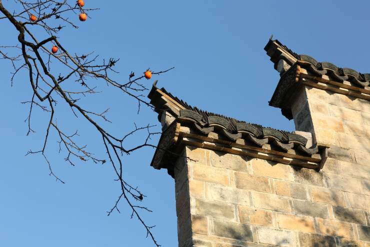 屋脊獸飾的總稱吻獸,吻獸跟挑角多彩當屬寺廟祠堂建筑上,挑角又名翅角、撓角。平遙古城深藏著珍稀的人物驅獸屋脊圖。昆明圓通寺屋頂正中的寶塔氣派端正,翅角飛禽走獸象是在排隊觀日出。山東徐福家鄉紀念性建筑物,徐公祠大殿翅角獸伸著脖子像在嗅盛開的櫻花。徽州官宅屋頂的麒麟顯示著此處宅院與民宅不同。塔川柿子熟了遲遲不愿離開枝頭,膩著相處多日的翅角竊竊私語。古城臨安天君廟的挑角,向著無暇天空笑靨如花。