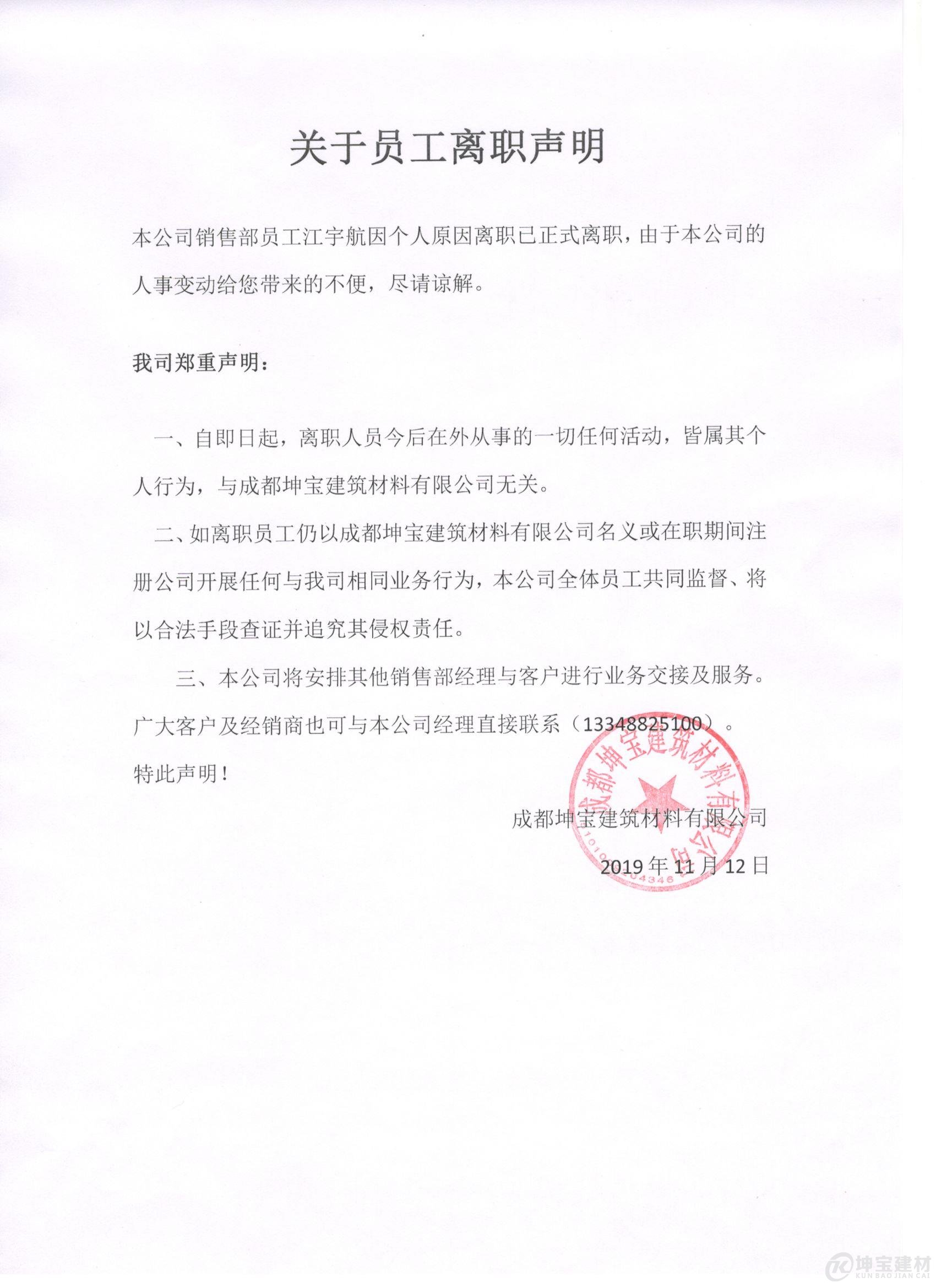 本公司銷售部員工江宇航(511111199610256318 ,15528000564,17019961025)因個(gè)人原因離職已正式離職,由于本公司的人事變動(dòng)給您帶來的不便,盡請(qǐng)諒解。我司鄭重聲明: