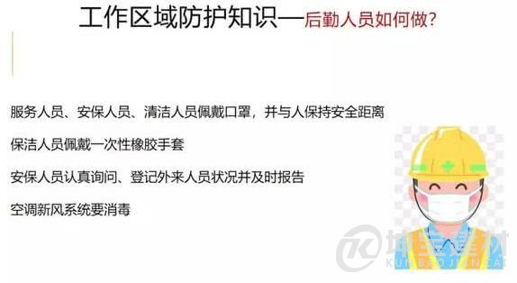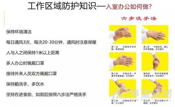 保持辦公區環境清潔,建議每日通風3次,每次20-30分鐘,通風時注意保暖。人與人之間保持1米以上距離,多人辦公時佩戴口罩。保持勤洗手、多飲水,堅持在進食前、如廁后按照六步法嚴格洗手。接待外來人員雙方佩戴口罩。