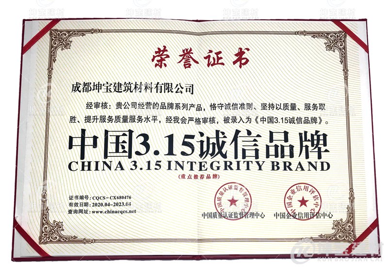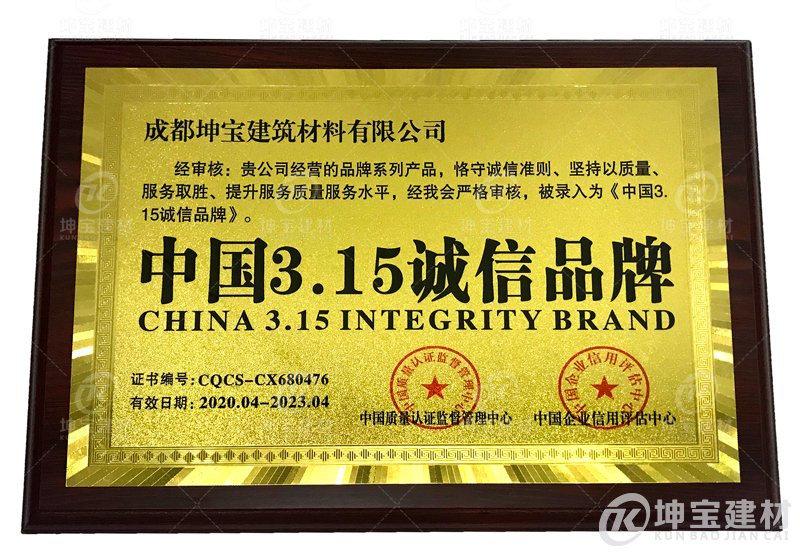 由中國質(zhì)量認(rèn)證監(jiān)督管理中心舉辦,通過對(duì)千余家企業(yè)的誠信、質(zhì)量情況進(jìn)行明察暗訪, 并結(jié)合企業(yè)信用評(píng)估中心,由專家組嚴(yán)格審核后,坤寶樹脂瓦以優(yōu)異表現(xiàn)榮獲由中國質(zhì)量認(rèn)證監(jiān)督管理中心,中國企業(yè)信用評(píng)估中心頒發(fā)的“中國315誠信品牌”,得到公會(huì)和業(yè)內(nèi)專家的一致認(rèn)可。坤寶樹脂瓦憑借可靠的企業(yè)信用,過硬的產(chǎn)品質(zhì)量,和優(yōu)質(zhì)的售后 服務(wù),順利通過考核,獲此殊榮。