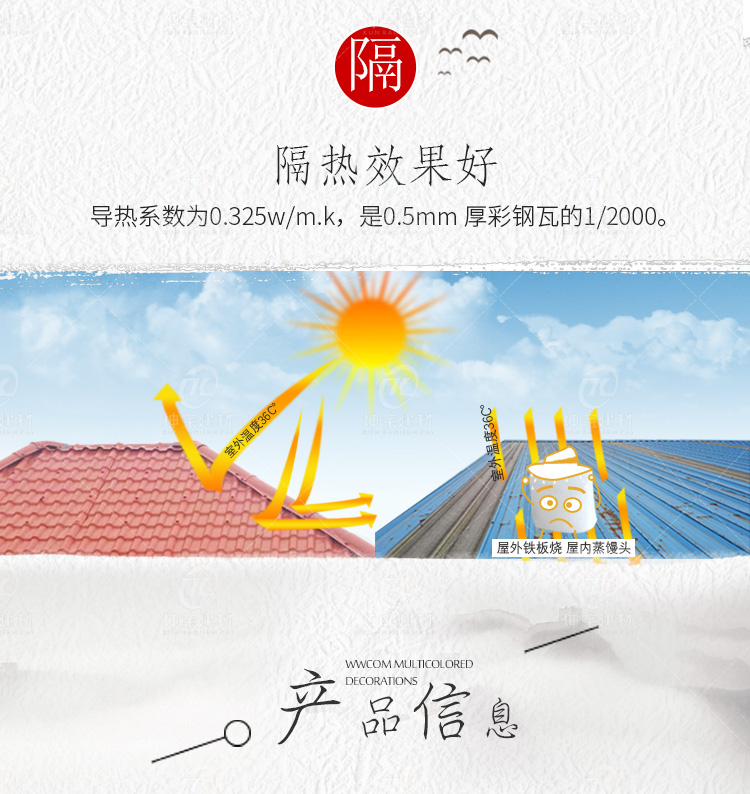 用途:平改坡屋面,別墅屋面,農村自建房屋面,民宅屋面,工業廠房,仿古建筑,涼亭圍墻裝飾等