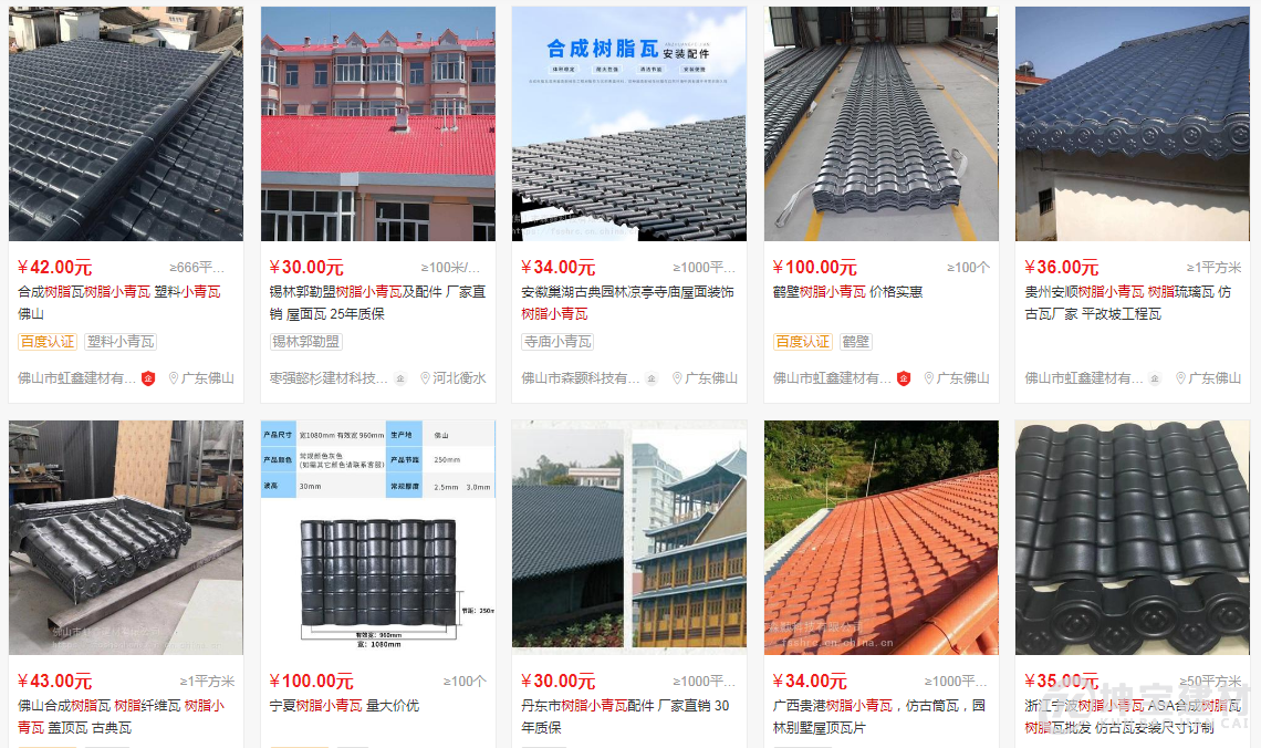 一下截圖是愛采購的仿古樹脂小青瓦價格(30-100元)